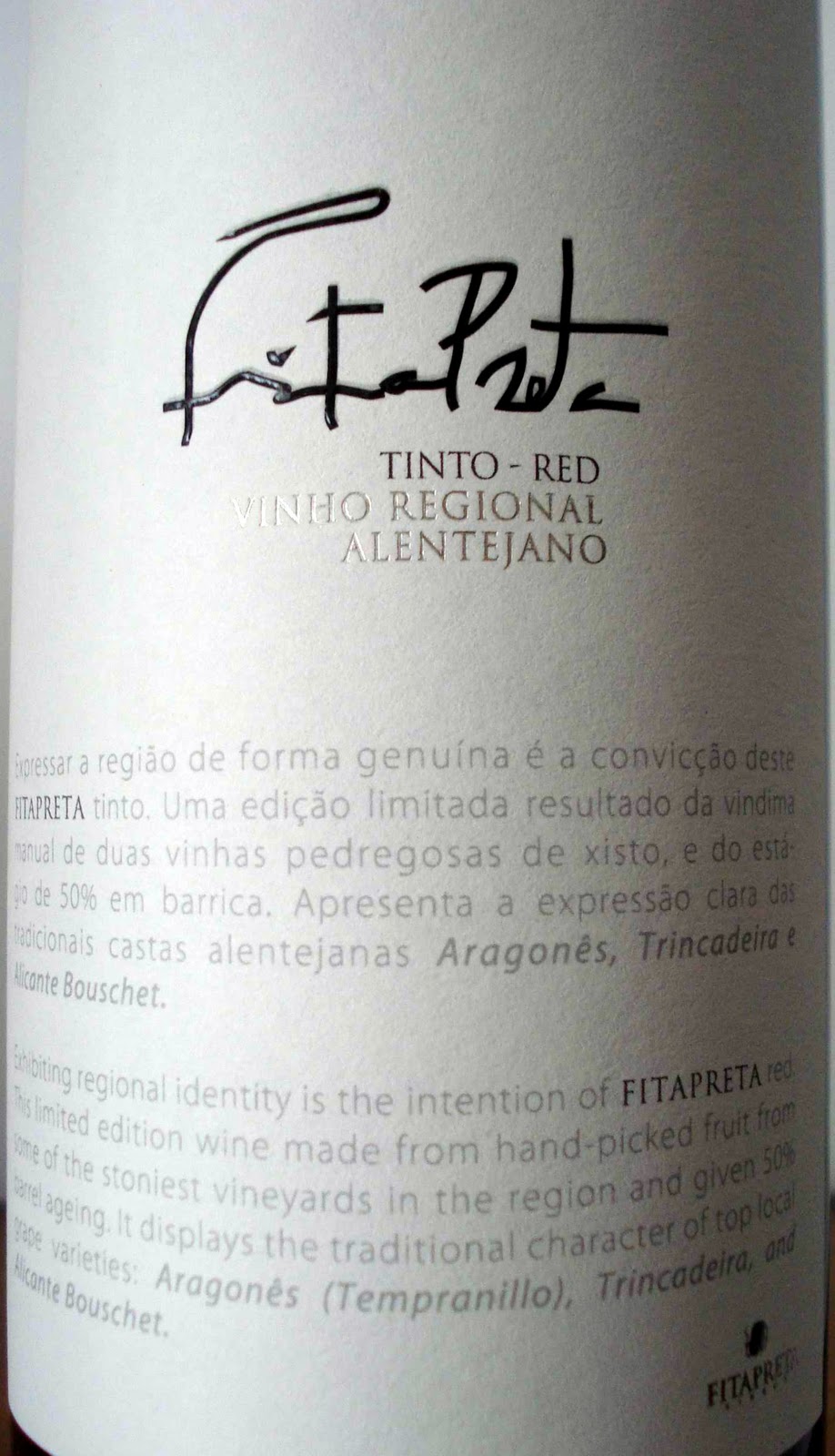 A expressão "sentido de origem" é o fio-de-prumo da criação deste FitaPreta branco. Uma edição limitada que nasce da vindima manual de uma vinha pouco produtiva e de uma enologia de intervenção mínima. A produção é reduzida, limitada a 6000 garrafas lançadas em Maio deste ano, um vinho que é uma novidade na gama de vinhos deste produtor Alentejano, um vinho que como já foi escrito, pretende mostrar o que é a região do Alentejo. Elaborado a partir de castas tipicamente alentejanas, a intervenção enológica é praticamente nula enaltecendo os verdadeiros aromas e sabores da região. Um vinho elaborado a partir das castas 40% Aragonês, 35%, Trincadeira, 25% Alicante Bouschet sabendo-se que apenas 50% do lote aprendeu a nadar em barrica francesa por 9 meses e que se apresenta com 14,5% Vol.